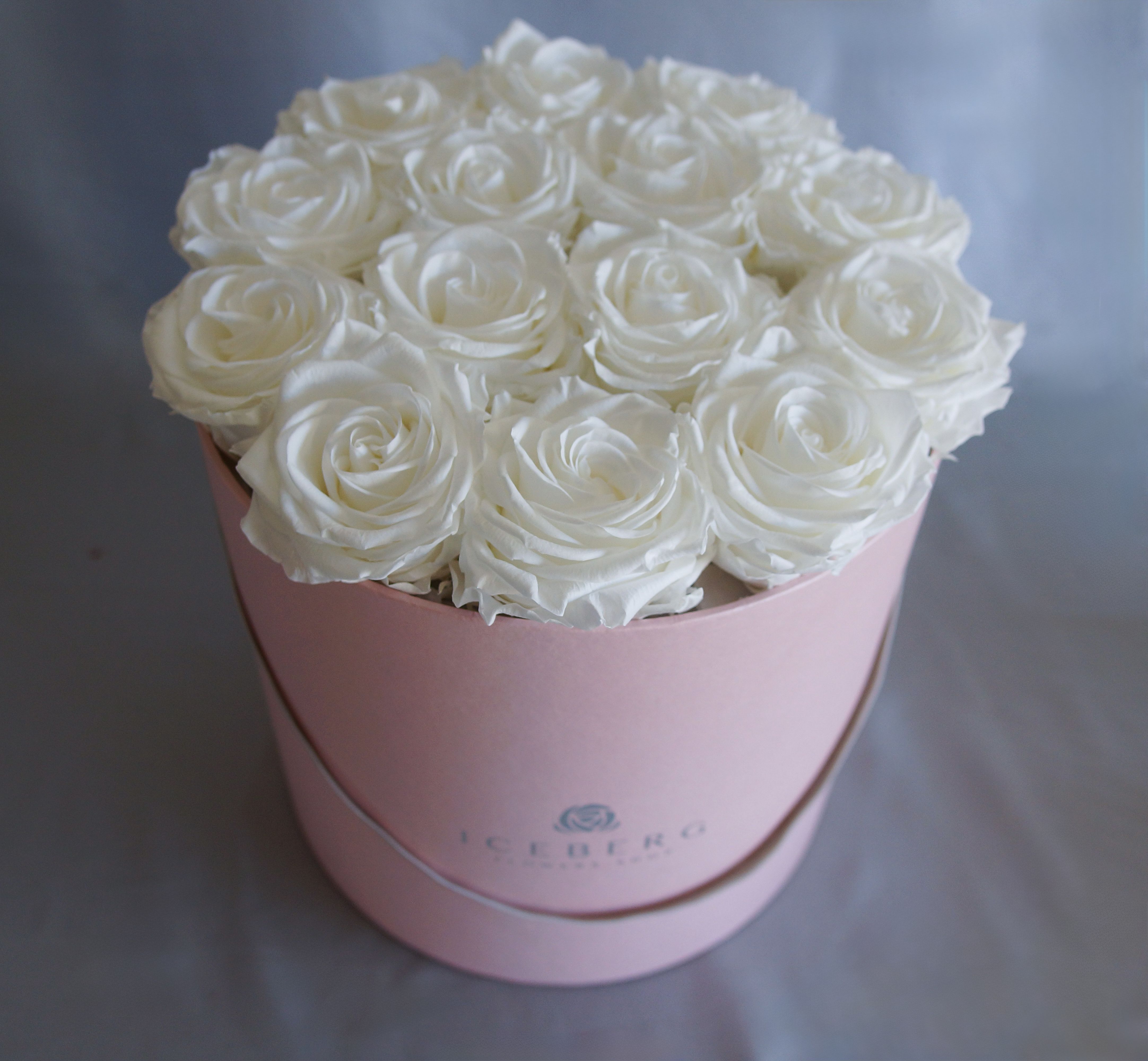 14 rosas preservadas de color blanco en caja rosa clarita